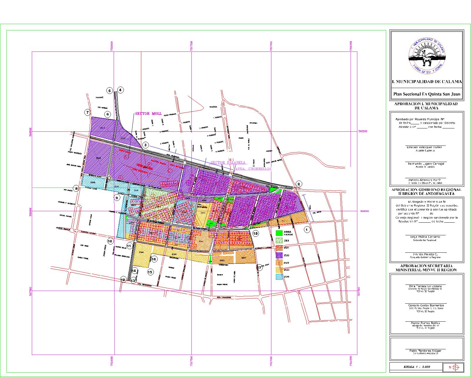 “La actual situación normativa del seccional ha generado un quiebre en cuanto a sus zonificaciones, dividiendo, por ejemplo, una misma cuadra en 2 tipos de zonificaciones, con usos que no posibilitan el desarrollo de proyectos de interés de inversionistas para la generación de renovación, densificación, o proyectos de interés recreacional, comercial o turístico para la ciudad, desaprovechando una excelente oportunidad de llevar a la ciudad de Calama por iniciativas que permitan incorporar al uso y calidad de vida de la ciudad, nuevas oportunidades de habilitación de áreas en un sector privilegiado y de gran plusvalía para nuevas oportunidades”. (Estudio Seccional, Agrupación Finca San Juan. Andrés Vega. Arquitecto. 2004)